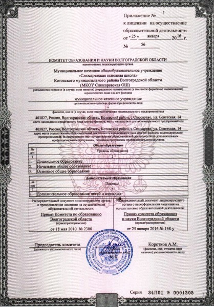 - Места осуществления образовательной деятельности по дополнительным образовательным программам: 403827, Волгоградская область, Котовский район, с. Слюсарево, ул. Советская, д. 14